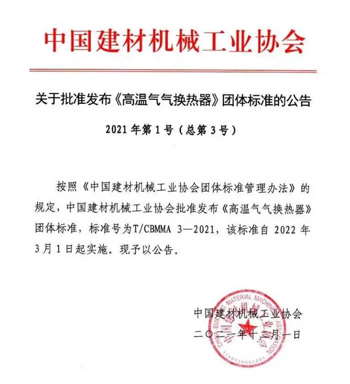 近日,中國建材機械工業(yè)協(xié)會發(fā)布公告,由安徽科達潔能股份有限公司、清華大學(xué)山西清潔能源研究院等主要負責(zé)起草的T/CBMMA 3—2021《高溫氣氣換熱器》團體標準獲批發(fā)布,自2022年3月1日起實施。