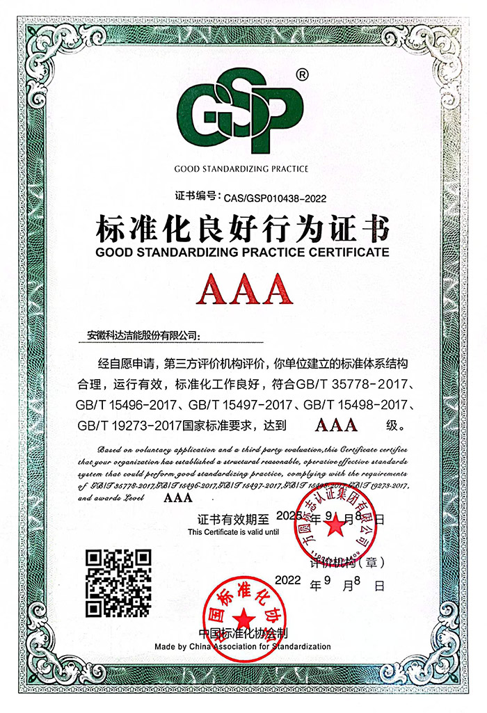 安徽科達潔能歷經社會評價、非現場評價、專家現場評價、復核等多階段評價,經過中國標準化協會縝密權威認定,我公司建立的標準體系結構合理、運行有效、標準化工作良好,符合國家標準要求,達到3A級水平。