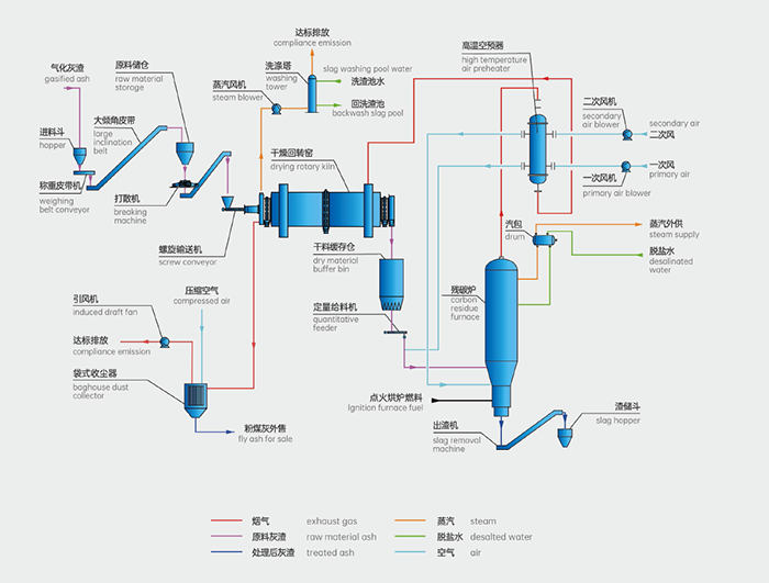 氣化灰渣經(jīng)大傾角皮帶輸送至原料儲倉,經(jīng)打散機破碎后送入干燥回轉(zhuǎn)窯中,干燥后灰渣送入保溫緩存?zhèn)},經(jīng)高溫一次風定量吹送進入殘?zhí)紶t,與高溫二次風共同進行反應。